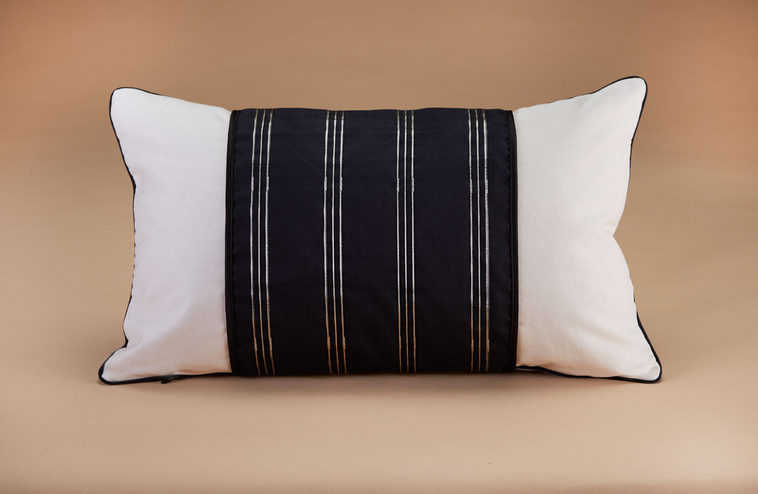 - A two-tone pillow cover in ivory and lavender gray, featuring black satin trim and a hidden zipper. Handmade in New York City from 100% OEKO-TEX® certified organic cotton.