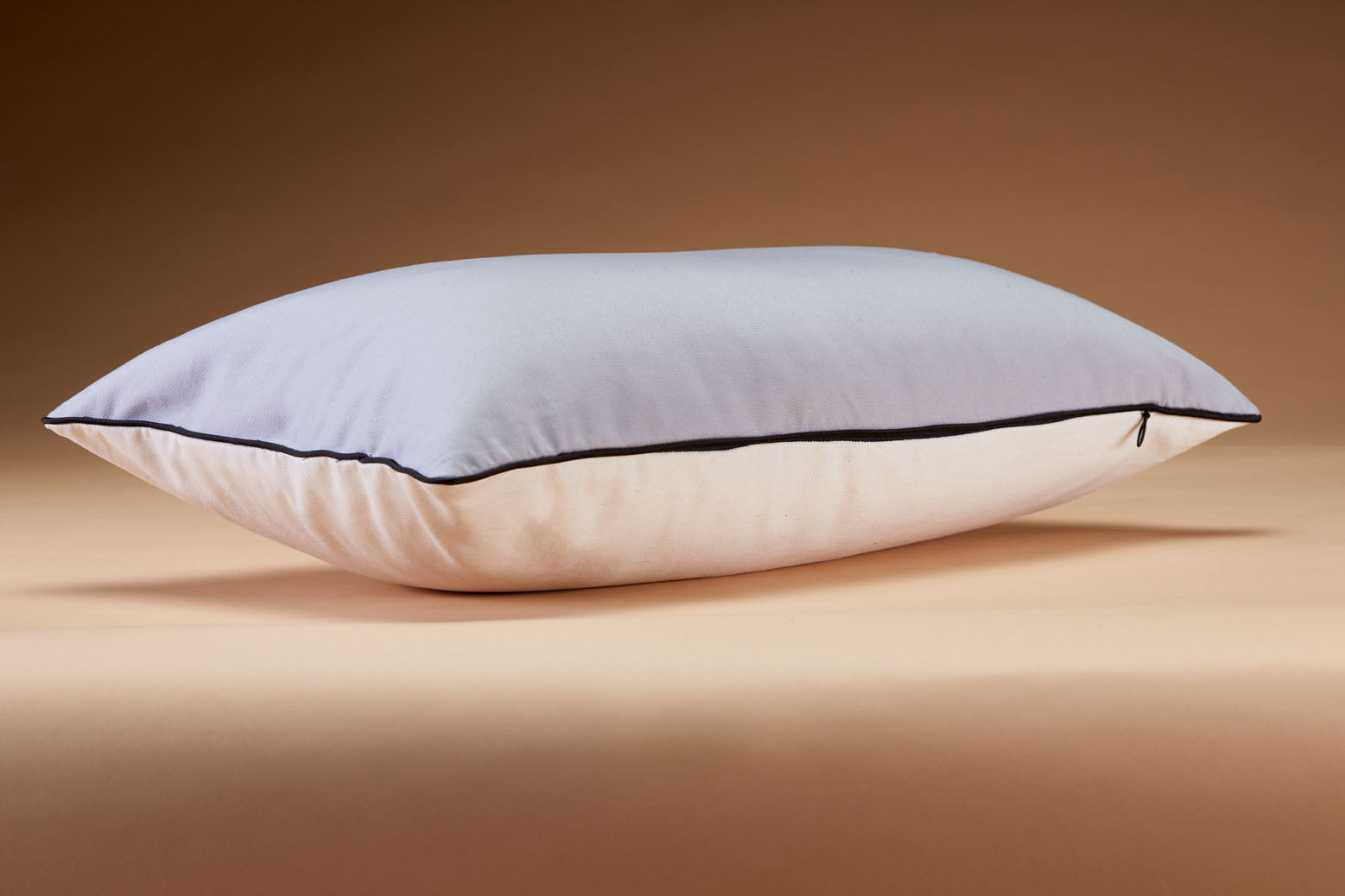 - A two-tone pillow cover in ivory and lavender gray, featuring black satin trim and a hidden zipper. Handmade in New York City from 100% OEKO-TEX® certified organic cotton.