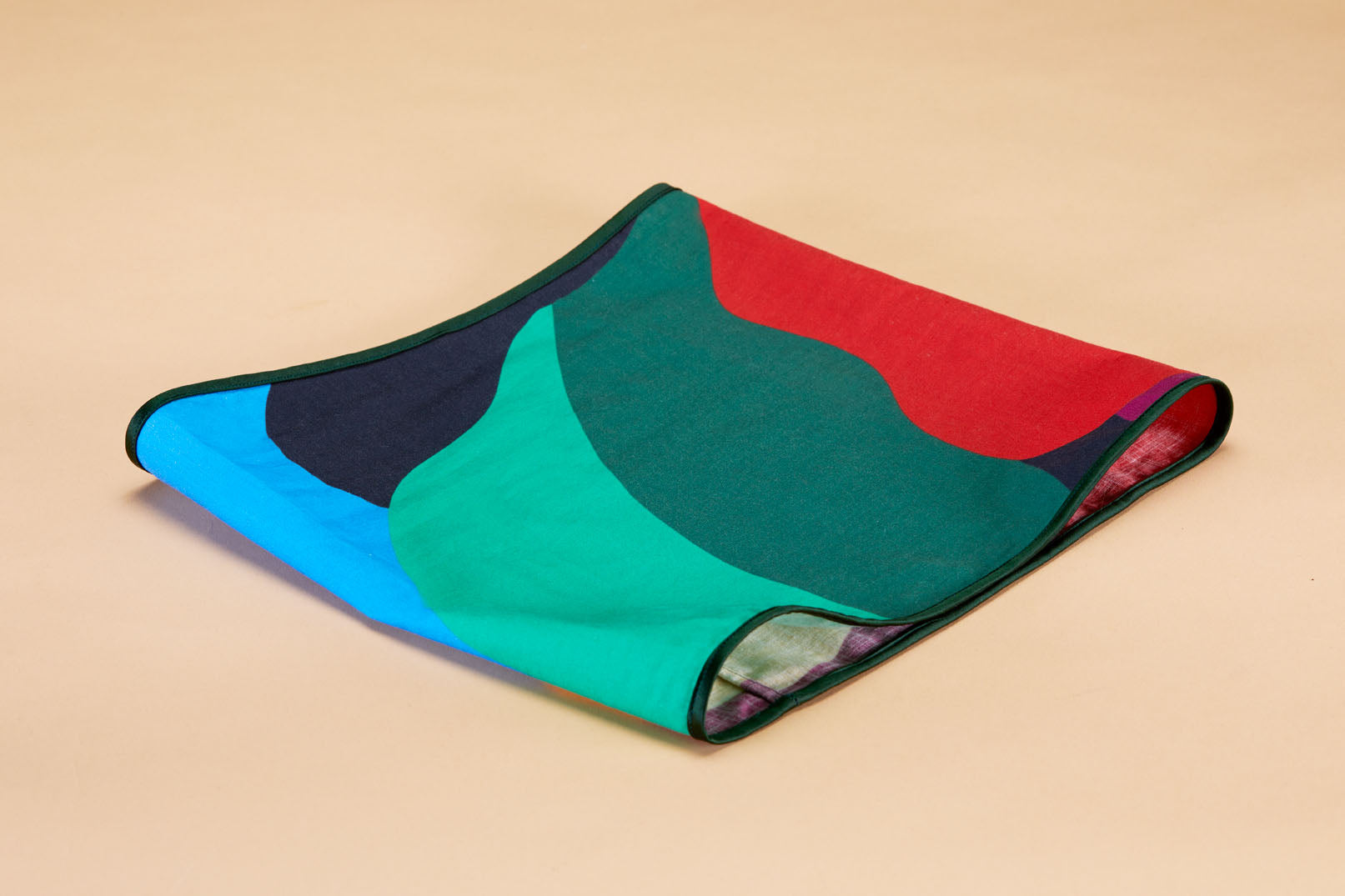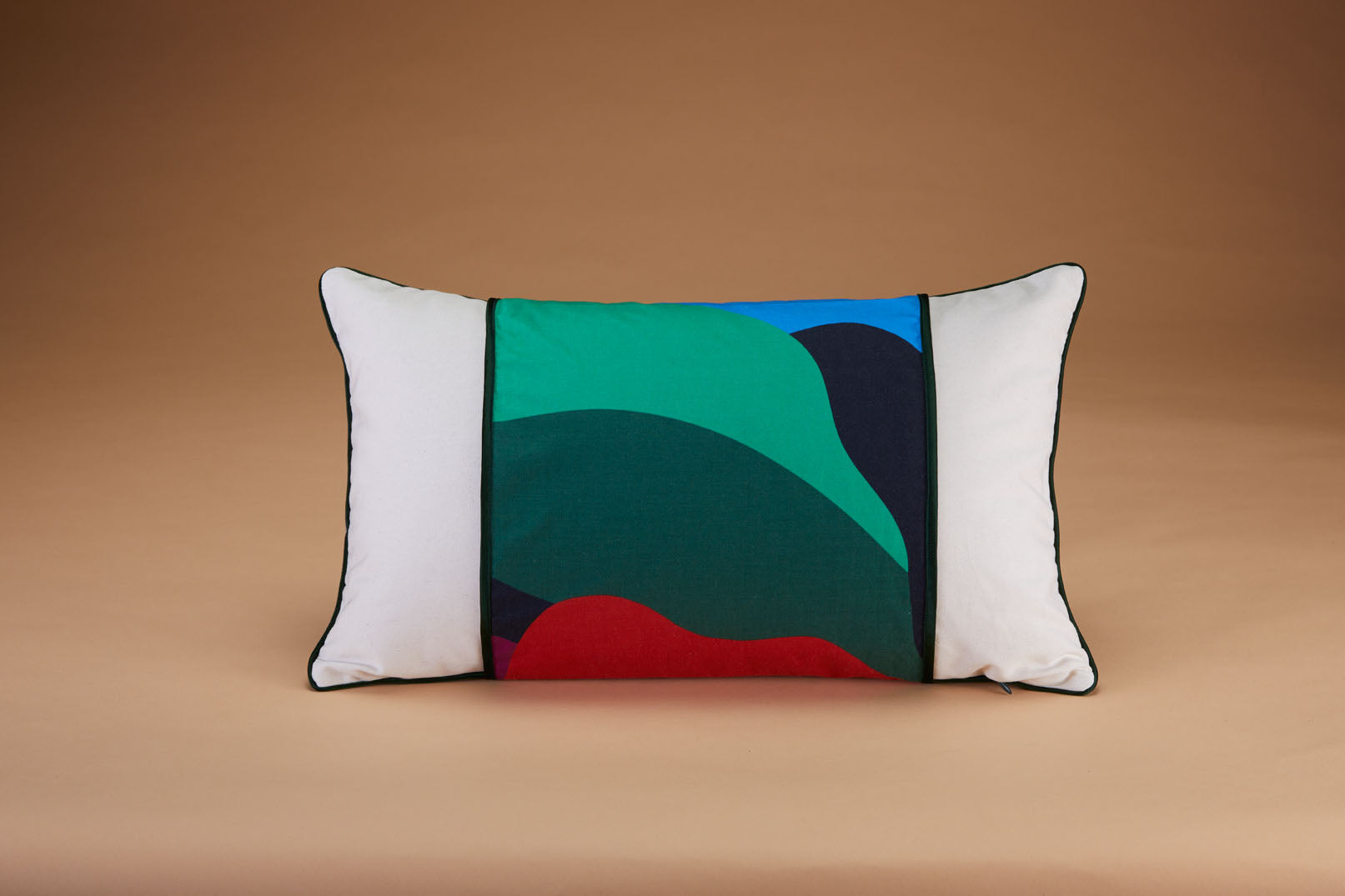 This handmade pillow sleeve crafted from 100% cotton is bold and playful. Finished with a dark green-colored silk trim, it is designed to comfortably fit 12 in x 20 in lumbar pillows.