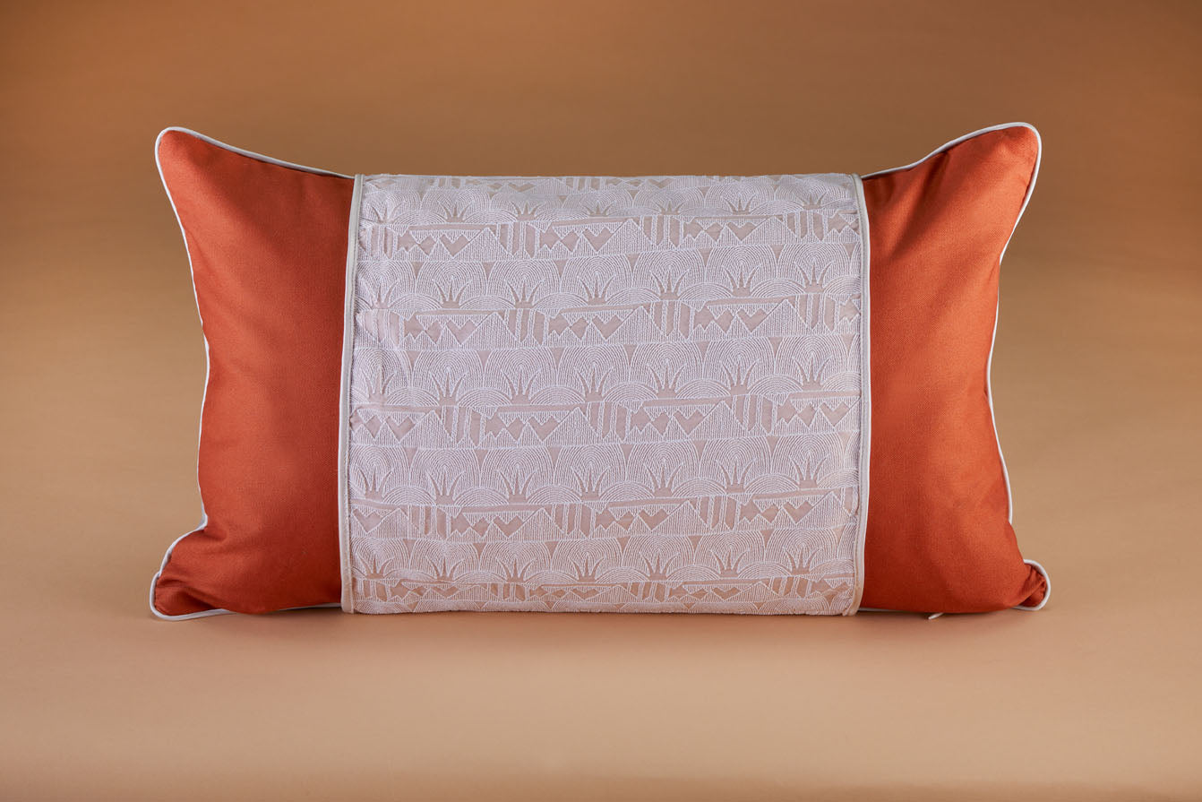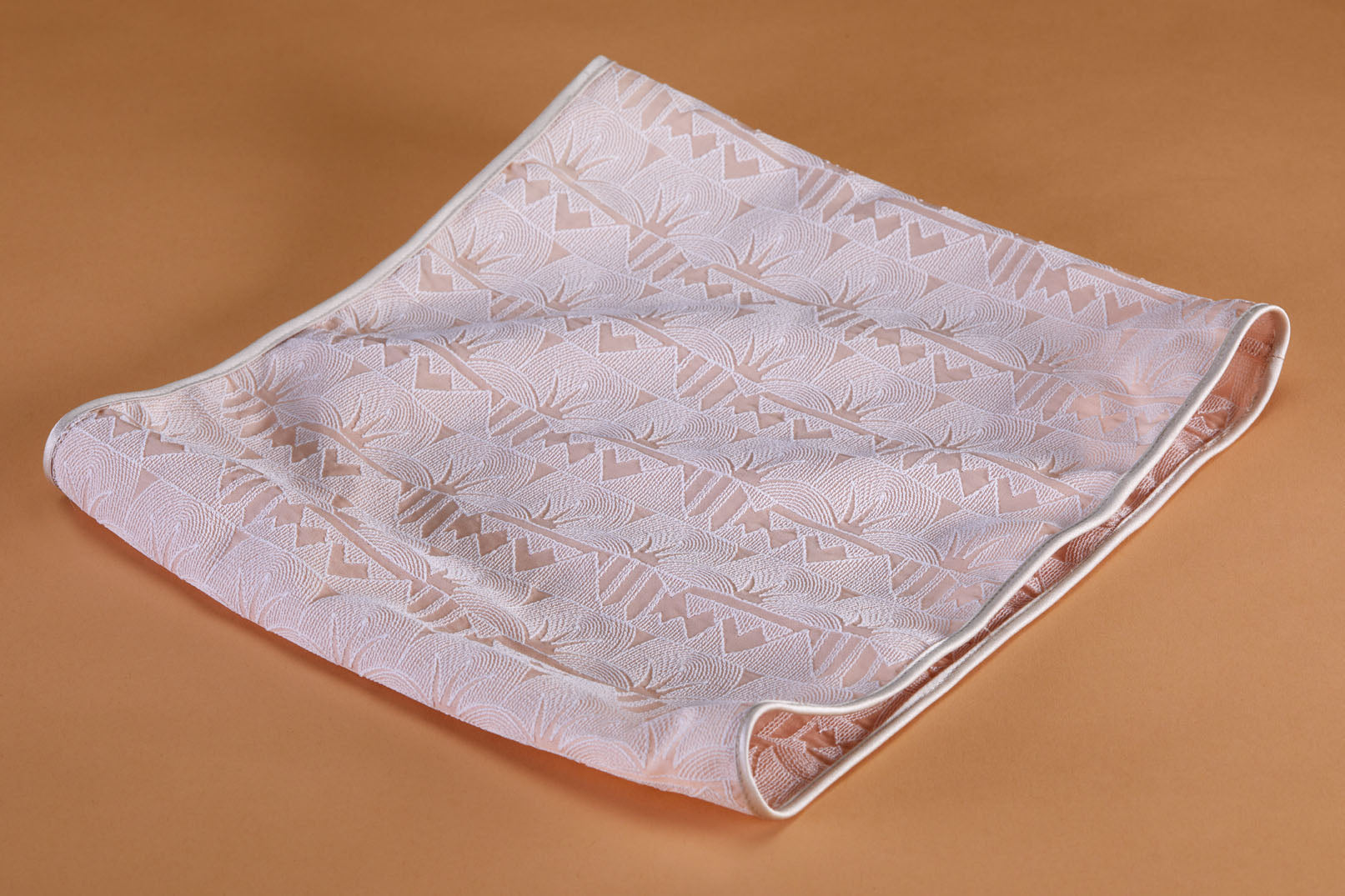 This handmade, deep seashell-colored sleeve is adorned with fine silk embroidery. Finished with champagne-colored satin trim, it adds a touch of understated elegance to any space.